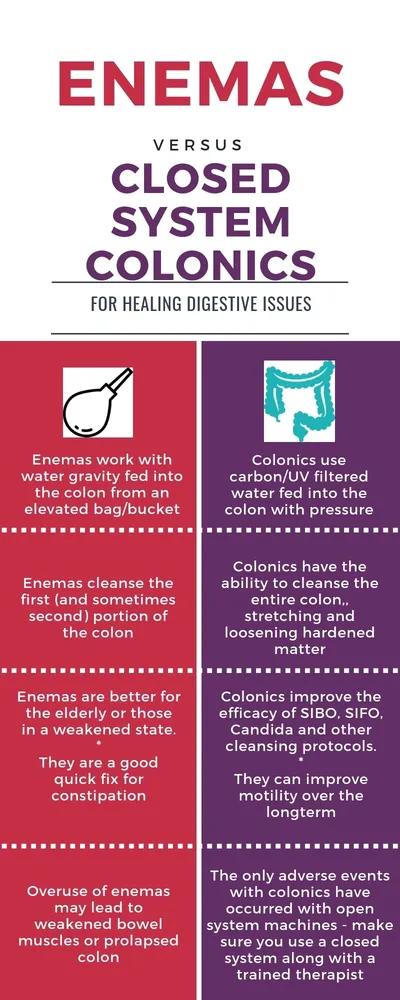 The basic principle behind enemas and colonics is the same: both are methods used to flush waste from the colon via water introduced into the rectum. Both can be highly effective in stimulating the colon to eliminate putrefactive waste from the body. However, there are notable differences between the two.